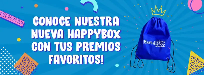 4 chapitas con diseños cool, bandana con diseño, alcohol gel figuras, botella glitter happyland, 2 pulseras top happyland, tarjeta happyland (cargada con 10.000 bonus + 100 tickets), happy bag
